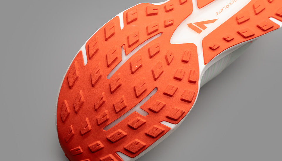 Välipohjaan on upotettu haaroitettu RockPlate. RockPlate lisää kengän jäykkyyttä erityisesti pitkittäissuunnassa ja vähentää näin juoksun energiahäviötä sekä terävöittää askellusta – samalla suojaten teräviltä kiviltä ja oksilta.
