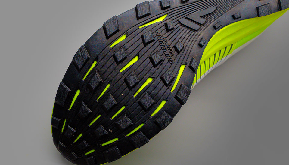 Välipohja on viimeistelty haaroitetulla komposiittilevyllä, joka lisää kiertojäykkyyttä, vähentää juoksun energiahäviötä sekä terävöittää askellusta – samalla suojaten teräviltä kiviltä ja oksilta.