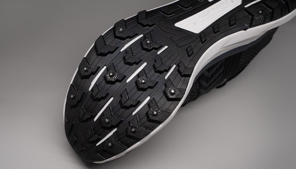 The Superior Contact -outsole features 17 carbon steel, star-shaped metal studs that provide superior grip on slippery conditions.