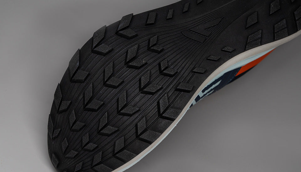Between the midsole and outsole you can find a full length rock plate which protects the bottom of the foot from sharp rocks and sticks. The rock plate also makes the shoe torsionally more rigid and decreases energy leakage.